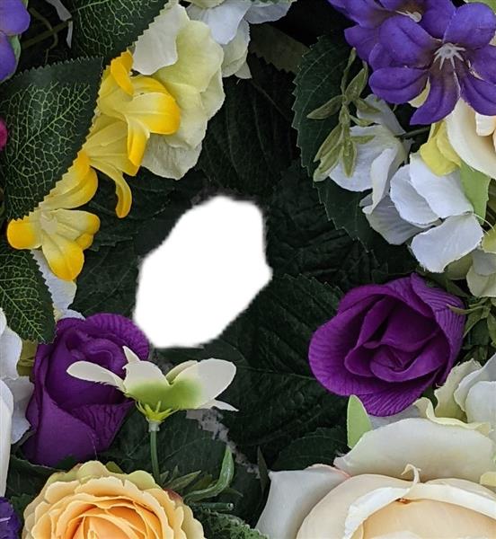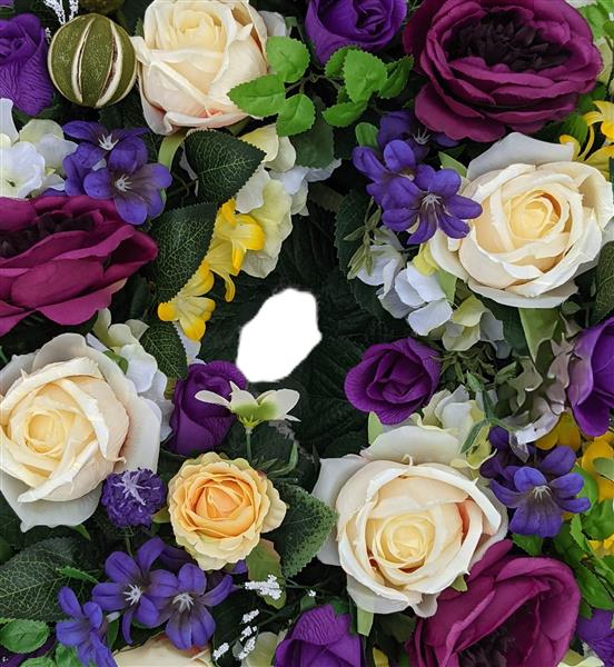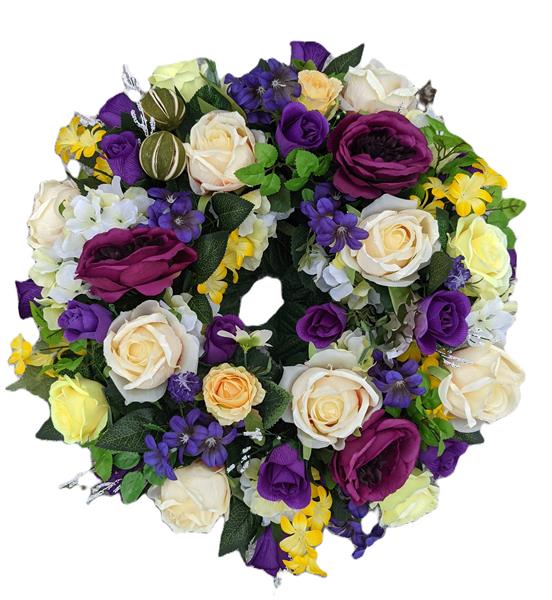 A large, artifical open wreath,as all flowers arent real this arrangement will last a long time, available in colour of your choice