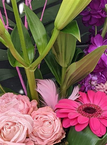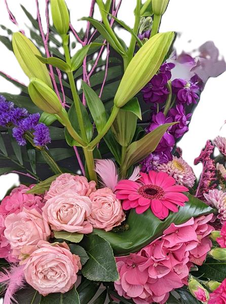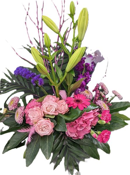 A beautiful versatile arrangement,in pink/purples which can be viewed from every side and still looks amazing,will be made in oasis,so receiver only has to place it in desirable place,