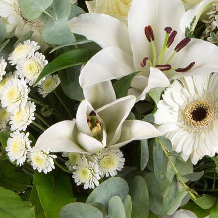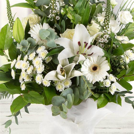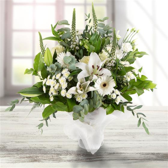 An elegant hand-tied bouquet of white lilies, roses, mini gerberas, chrysanthemums and flowing foliage.choice of flowers depends on stock available