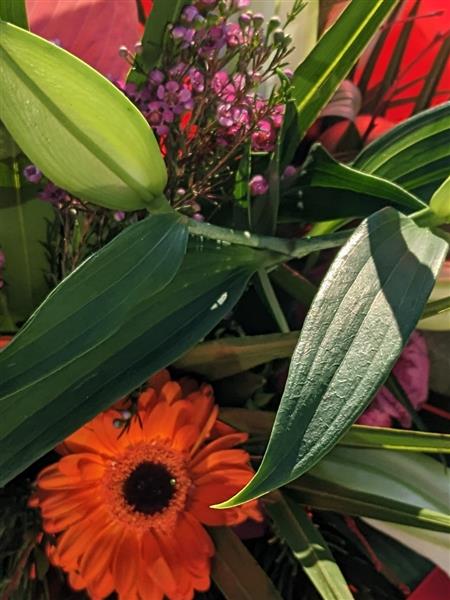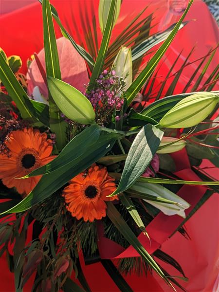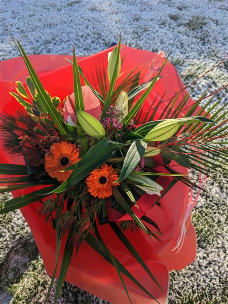 This beautiful arrangement includes lilies,Gerbera.s with a selection of seasonal foliage. Cones and silver clusters give this arrangement a stylish festive feel.