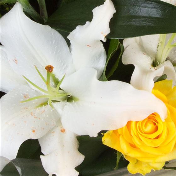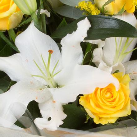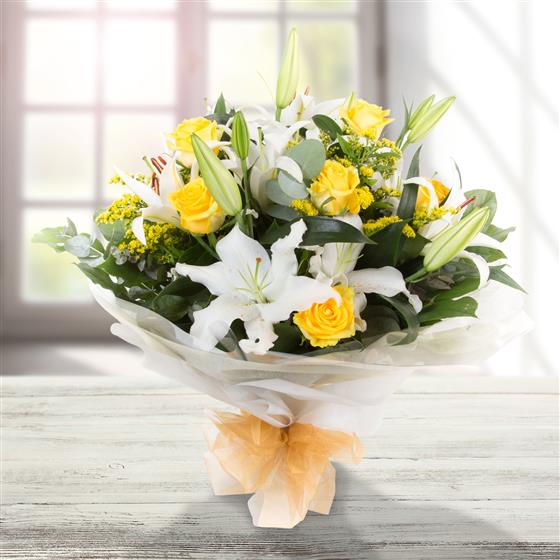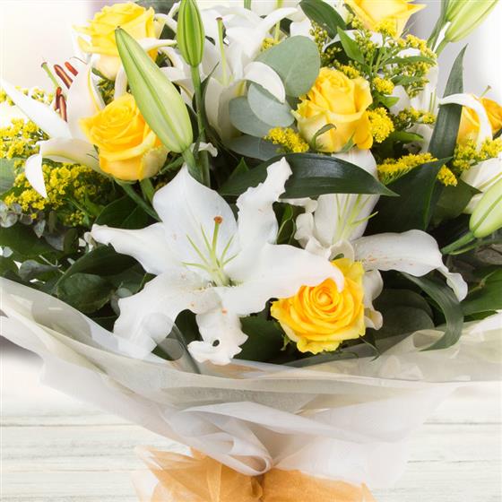 A fragrant delight of white oriental lilies and golden yellow roses mixed with solidaster and eucalyptus.choice of flowers depends on stock available