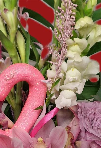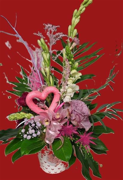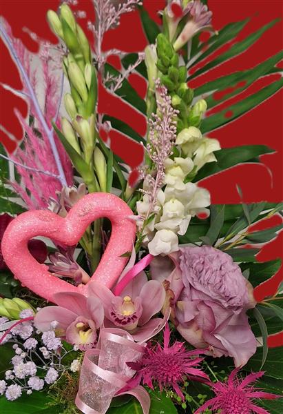 A show stopping arrangement,in pink, red, and white.with a hart,to show them your love, Vase included.choice of flowers depends on stock on day