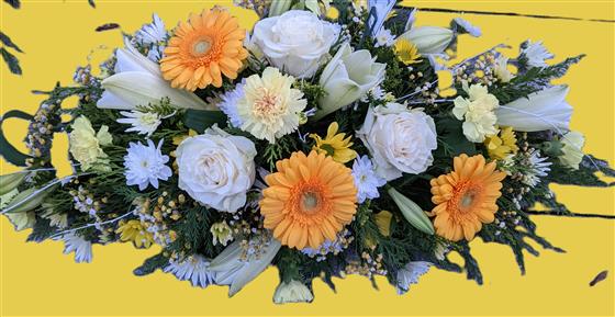 A contemporary double ended spray of longiflorum lilies, roses and gerbera's Please give ample time when ordering to ensure lilies are in full bloom.
