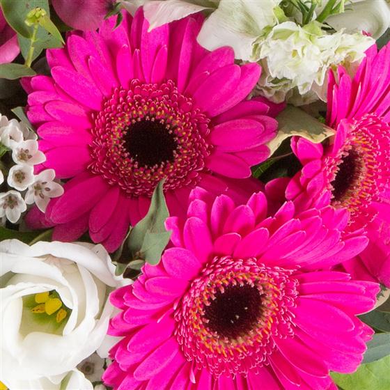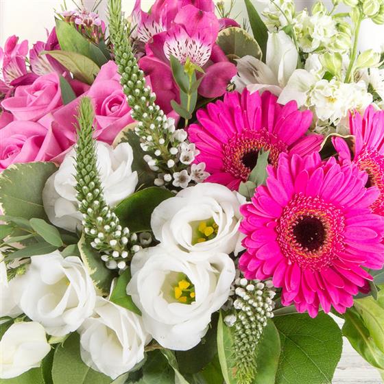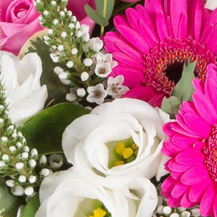 A compact cube arrangement of contrasting whites and cerise pinks blooms.