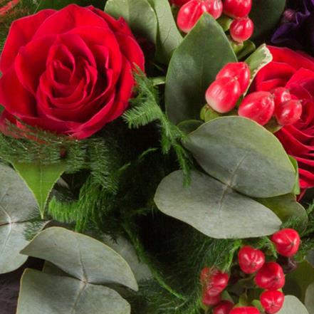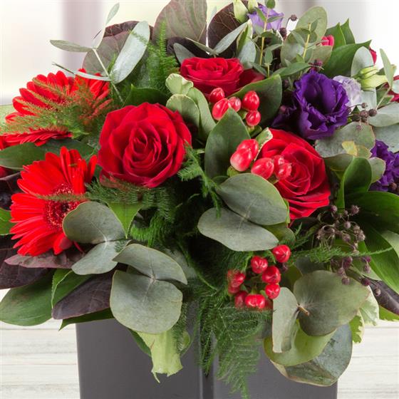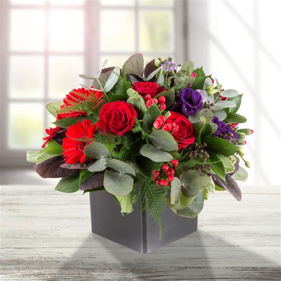 An opulent arrangement of scarlet red gerberas, deep red roses and rich purples combined with berries and unusual foliage.