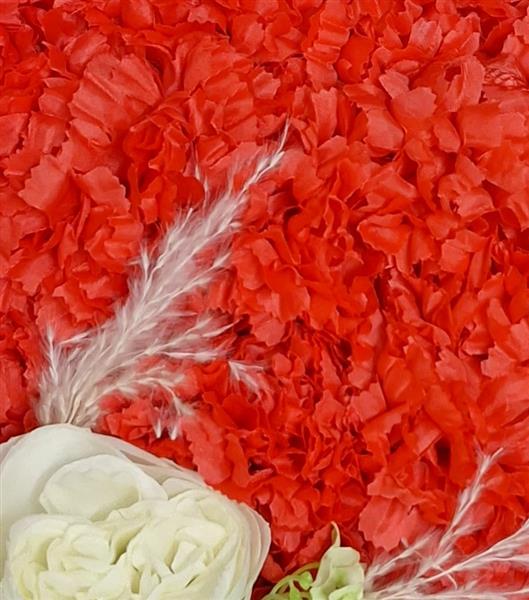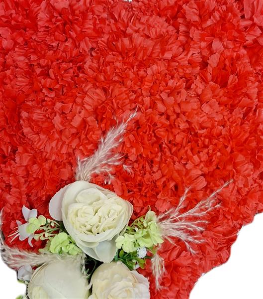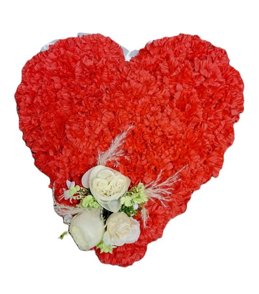 A heart shaped tribute created with artificial flowers available in all colours with choice of ribbon,and a few flowers on top,size in picture is standard.