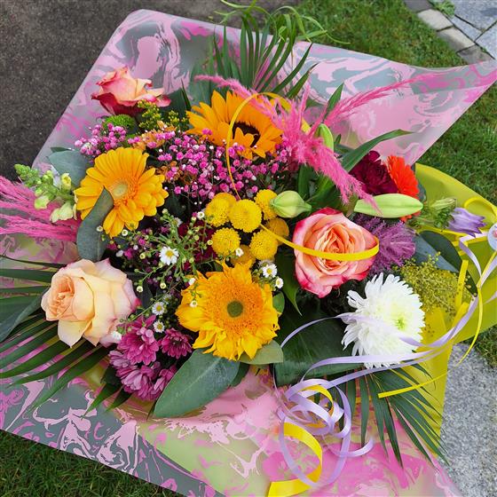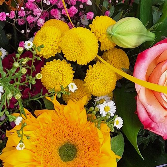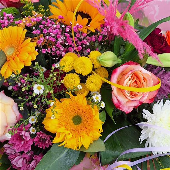 Pink and yellow roses,gerbera, and sunflowers, create a pretty array that is a joy to the senses.choice of flowers may change,as sunflowers are not always in season
