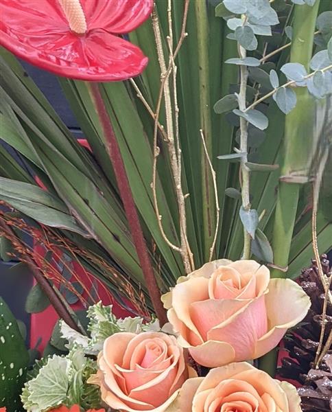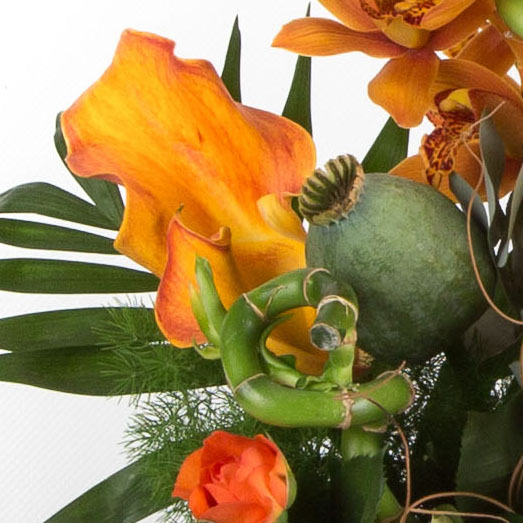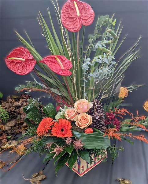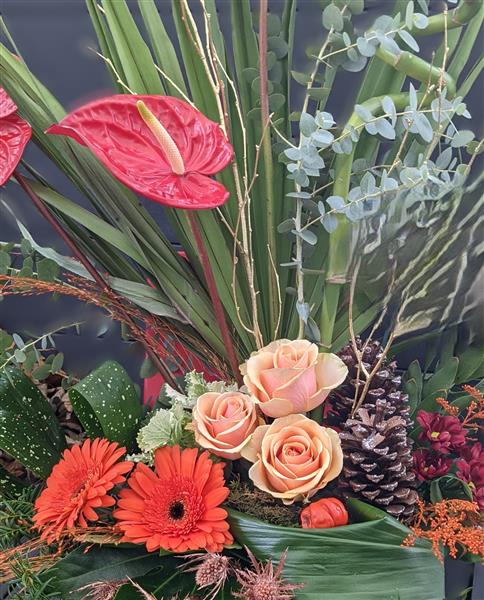An exotic mix of peaches, oranges and reds including Anthurium and roses,choice of flowers depends on stock available