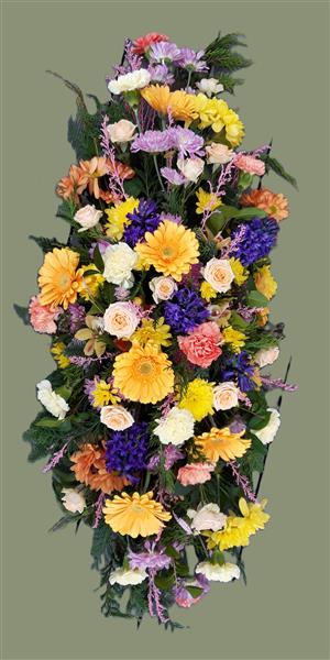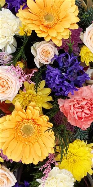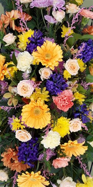 In summer blues, pinks, lilacs,yellow and purples this beautiful spray includes roses,hyacinths,chrysanthemums, gerberas and carnations.