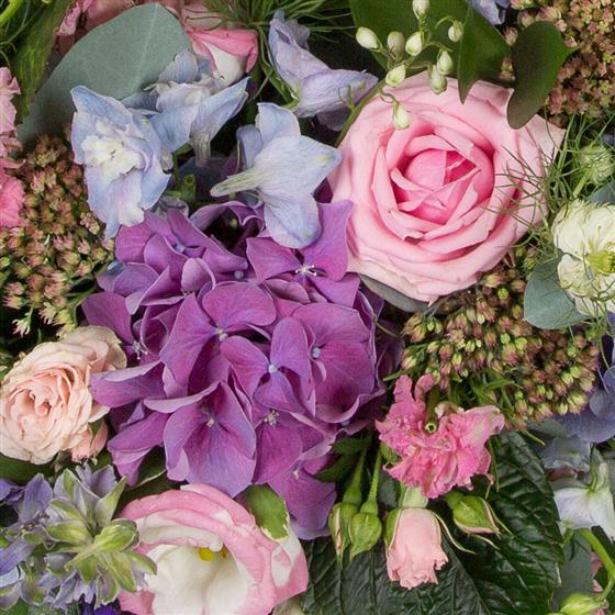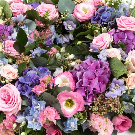 Larkpsur, hydrangeas, delphiniums, sedum, nigella, roses and lisianthus are included within this seasonal, summer bloom wreath. choice of flowers depends on available stock,but preference of colours can be specified