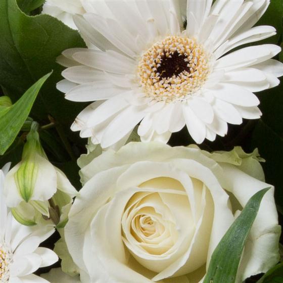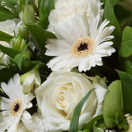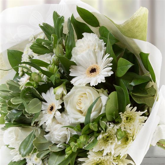 A simple hand-tied bunch of cream and white blooms including gerberas, chrysanthemums, carnations and alstromeria.this bouquet does not come in an aqua box ,so recepient will need to put into water themselves