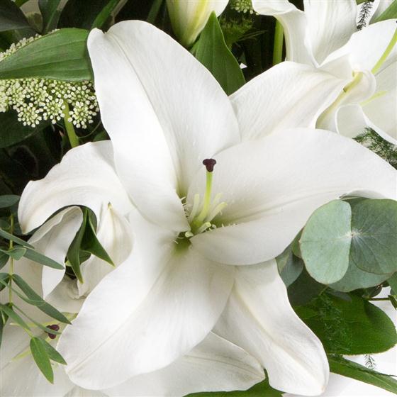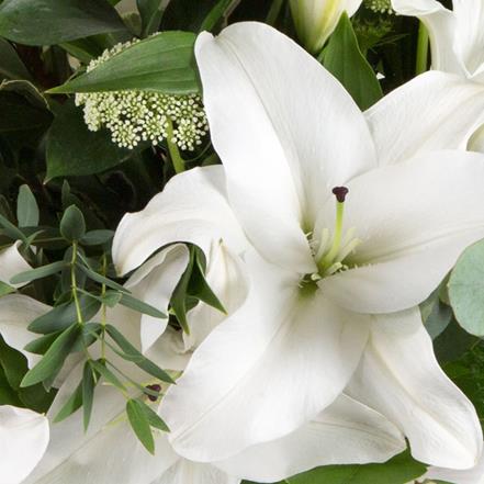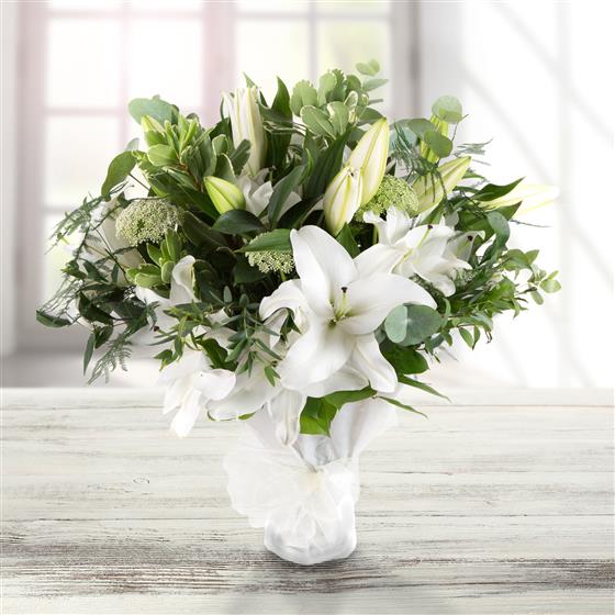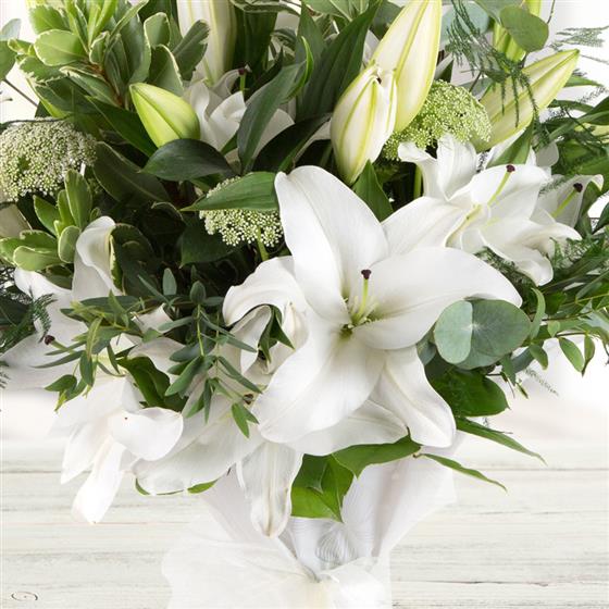 A simple, hand-tied bouquet of highly scented white oriental lilies and foliage.