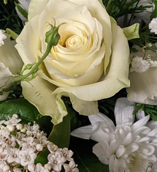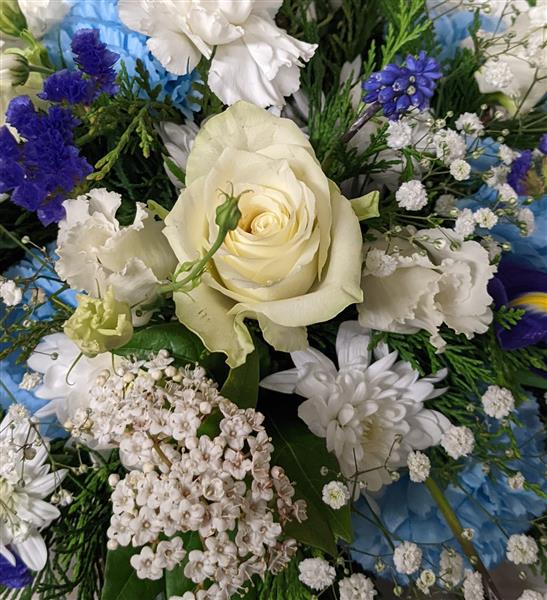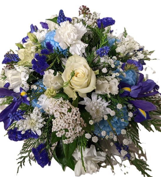 A mixed posy arrangement in baby blue and white flowers,choice of flowers depend on available stock.