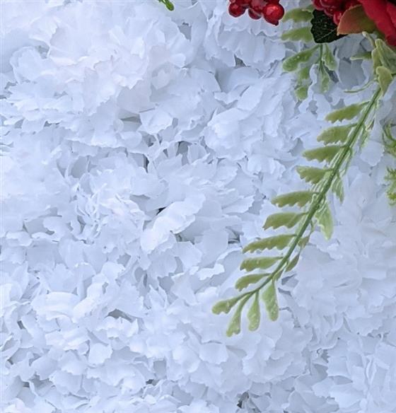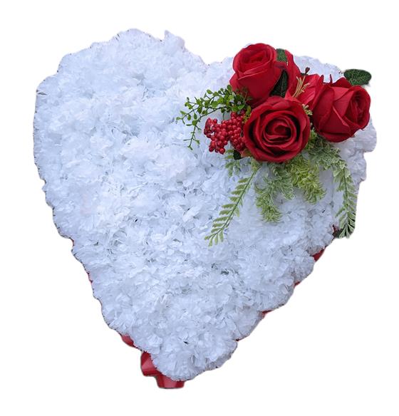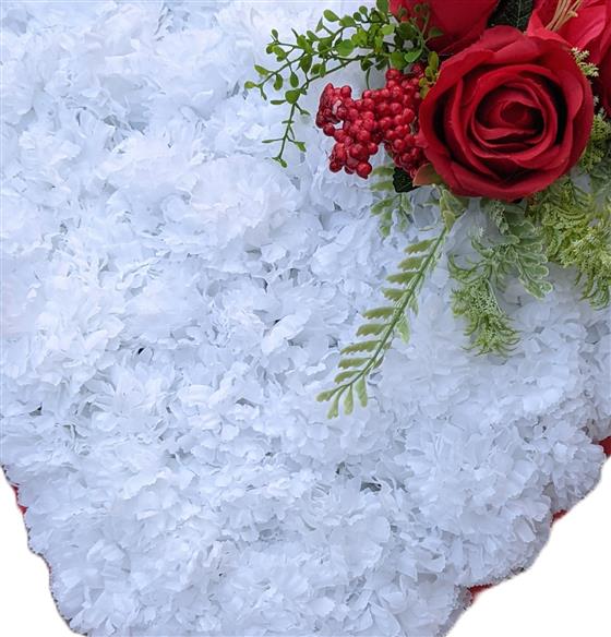 Heart with artificial flowers so they will last a long time,white flowers red ribbon and a little arrangement on top